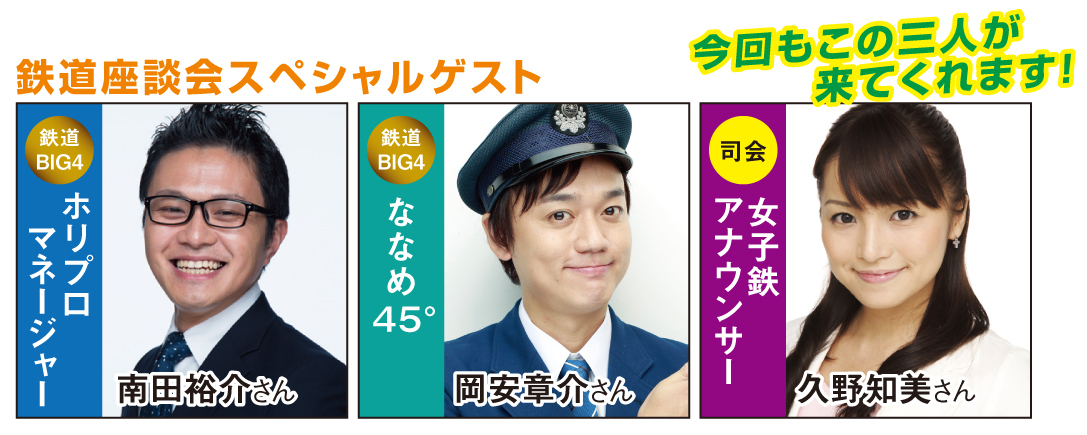 鉄道座談会では昨年に引き続き出演者は鉄道BIG4の一人「ホリプロマネージャー南田裕介さん」、同じく鉄道BIG4の一人「ななめ45°岡安 章介さん」、女子鉄アナウンサー久野知美さん司会による鉄道トークショーを開催!