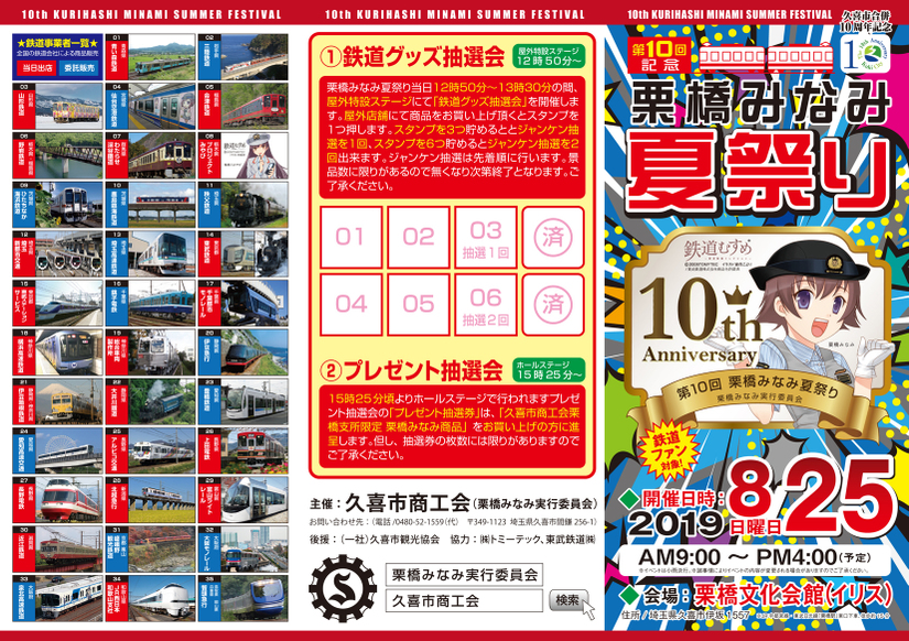 栗橋みなみ夏祭り当日12時50分~13時30分の間、屋外特設ステージにて「鉄道グッズ抽選会」を開催します。屋外店舗にて商品をお買い上げ頂くとスタンプを1つ押します。スタンプを3つ貯めるととジャンケン抽選を1回、スタンプを6つ貯めるとジャンケン抽選を2回出来ます。ジャンケン抽選は先着順に行います。景品数に限りがあるので無くなり次第終了となります。ご了承ください。