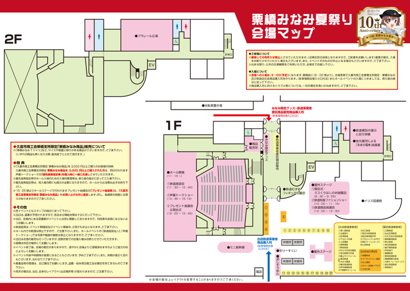 ※会場への入場は、9:00(予定)になります。開場前に(8:00頃より)、主催者側で久喜市商工会限定・栗橋みなみグッズ(駐車場側会場入り口付近)及び鉄道事業者グッズ商品購入列をそれぞれ作ります。(道路側会場正面入り口付近)またホールイベントの入場につきましては、係り員の指示に従って下さい。