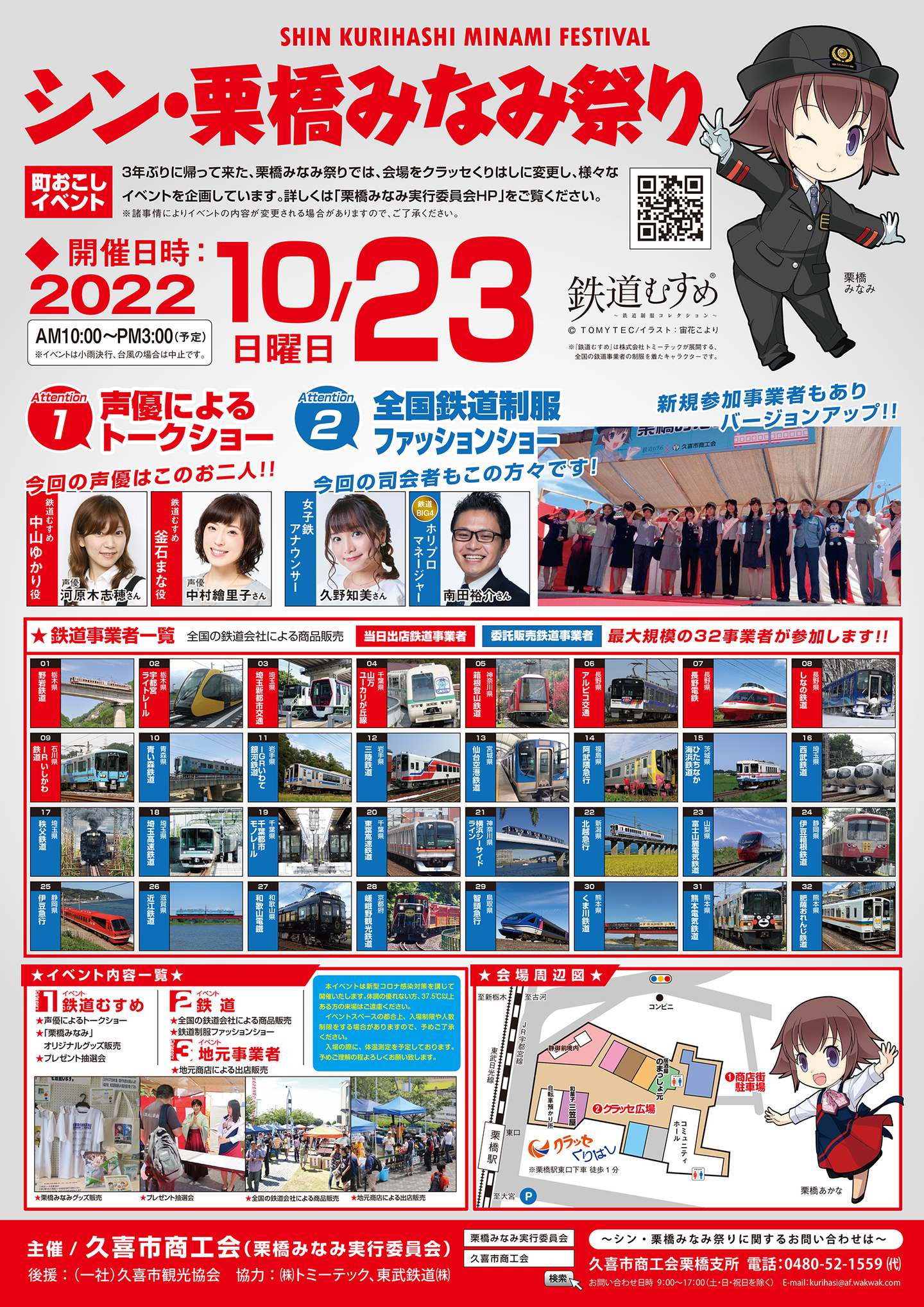 1つ目は鉄道むすめイベントとして、スペシャルゲストをお招きしての声優トークショー。栗橋みなみオリジナルグッズの販売やプレゼント抽選会を予定しています。今回の声優トークショーは、今回初参加となる声優の中村繒里子さんと栗橋みなみイベントではお馴染みの河原木志穂さん等に、ご参加いただき楽しいトークショーを屋外特設会場で予定しております。