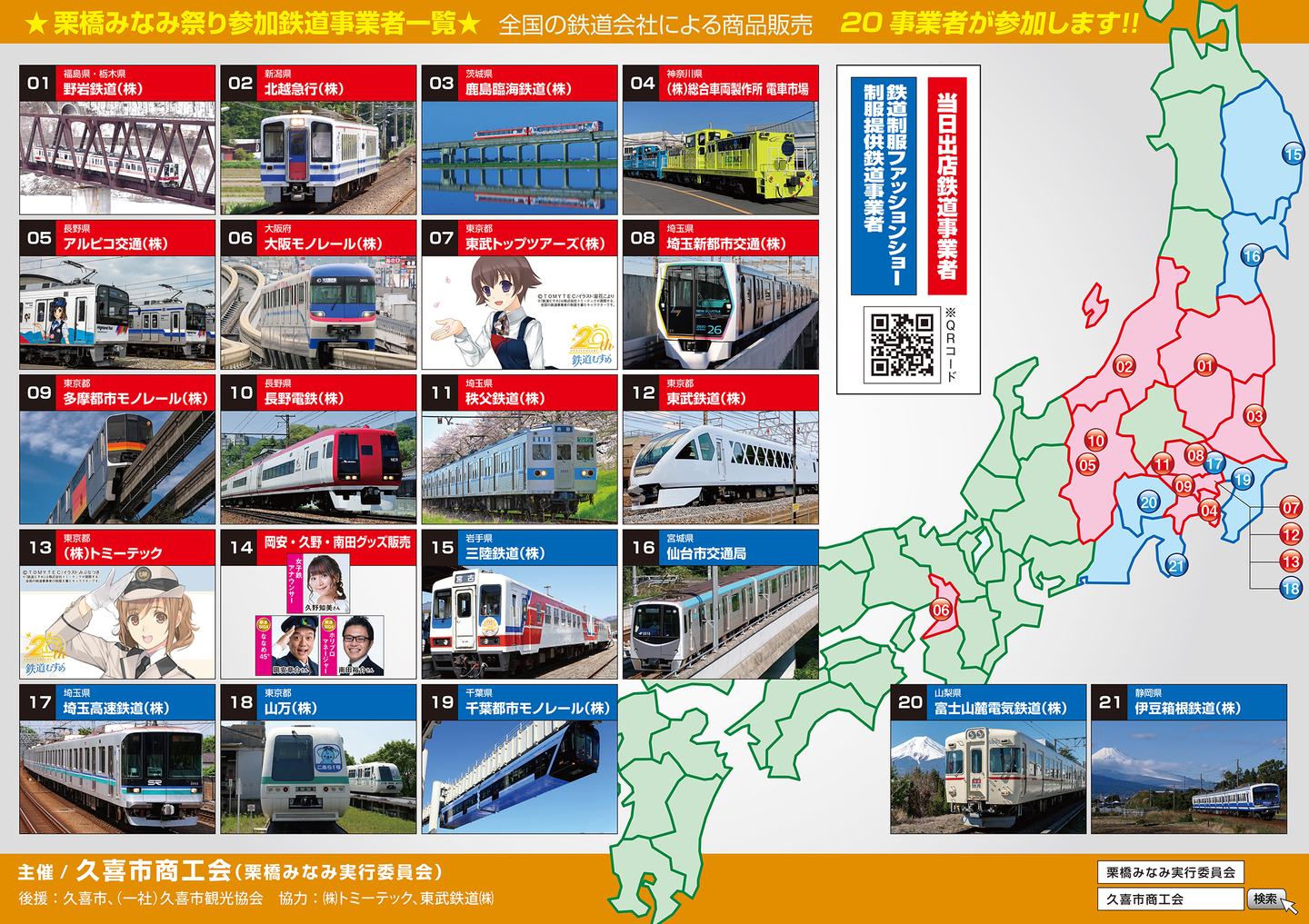4/20(日)に開催される栗だし市(同時開催:栗橋みなみ祭り)にご出店頂く鉄道会社様です。(敬称略・順不同)