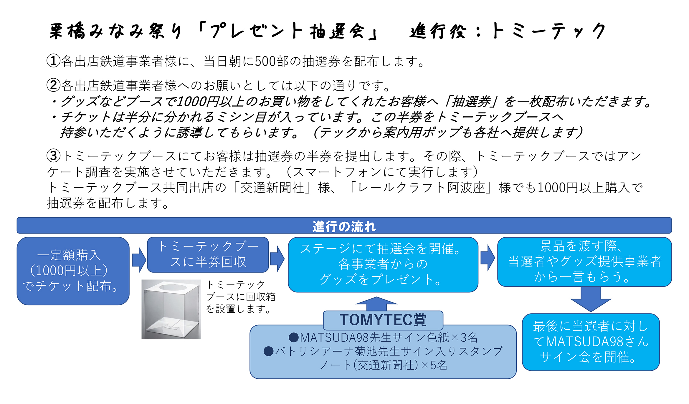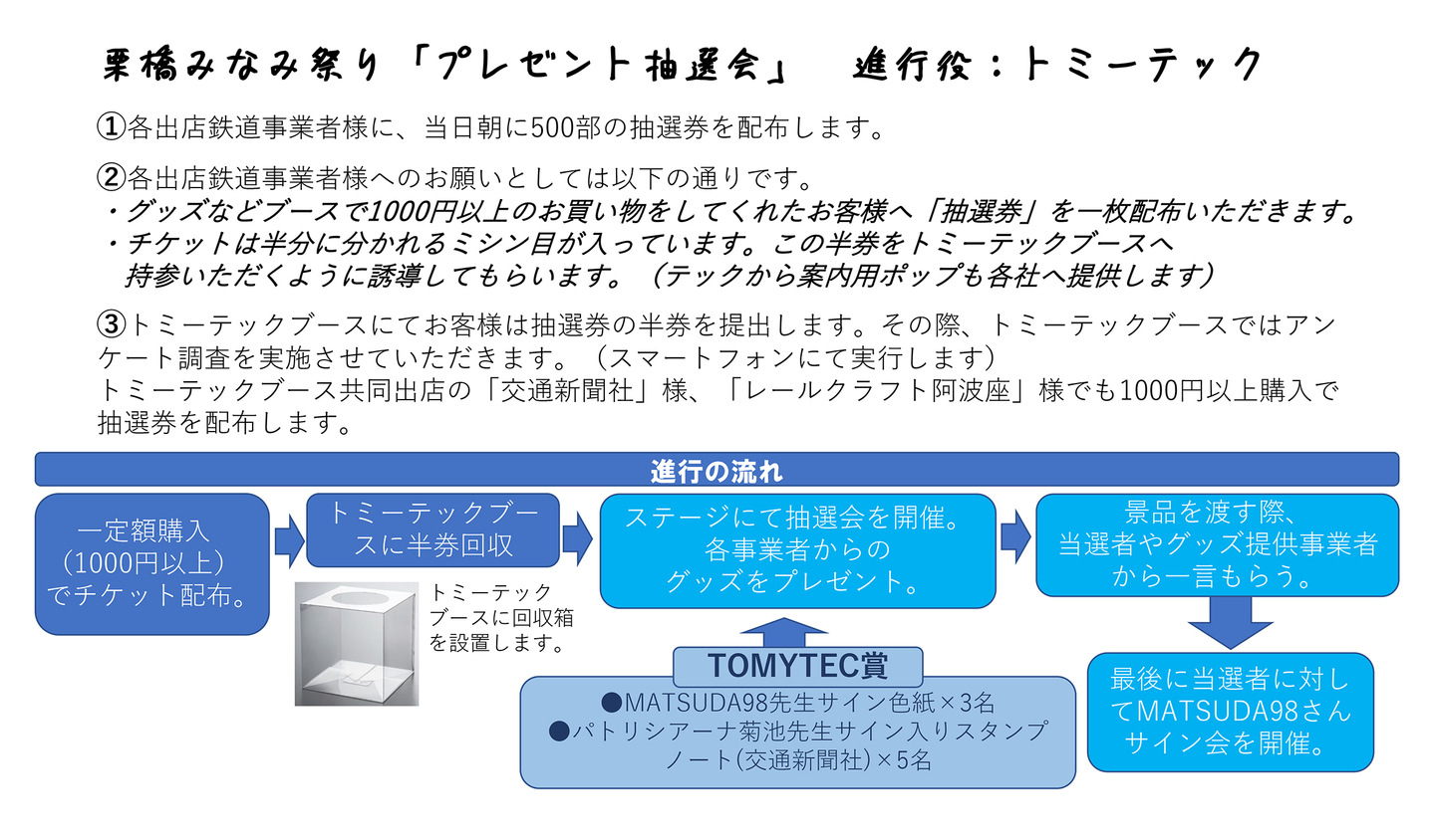 ◎会場への入場は、9:00(予定)になります。開場前に(8:30頃より)、主催者側で久喜市商工会限定・栗橋みなみ及び鉄道会社各商品購入列を作ります。