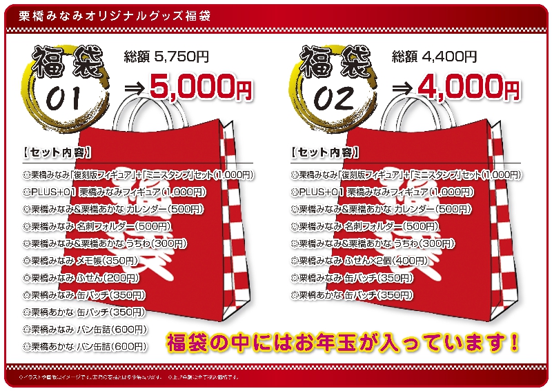 ※福袋を購入してくれた方には、お年玉(栗橋商工会限定 栗橋みなみ&栗橋あかなイラスト入り)がついてきます。