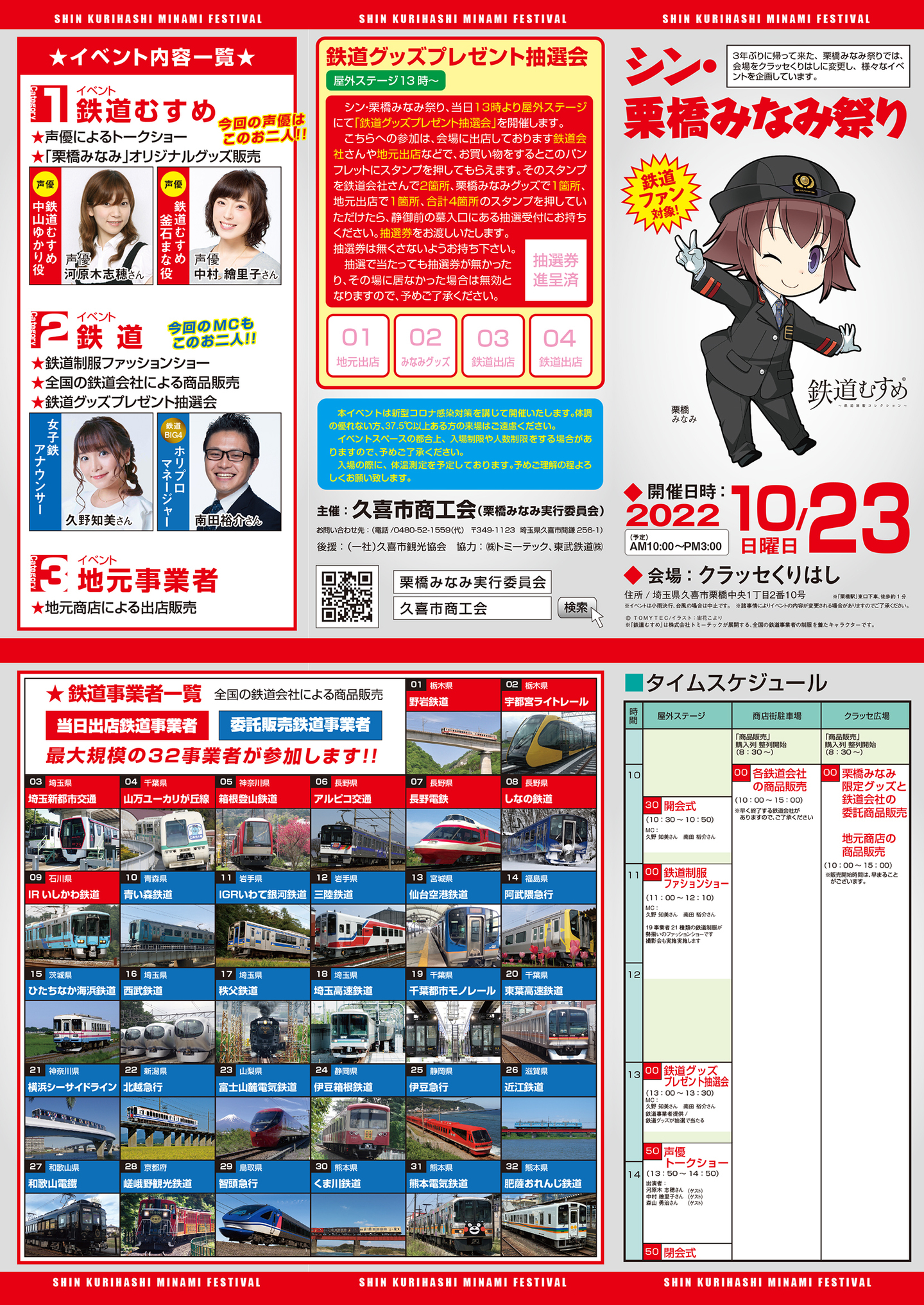 1つ目は鉄道むすめイベントとして、スペシャルゲストをお招きしての声優トークショー。栗橋みなみオリジナルグッズの販売やプレゼント抽選会を予定しています。今回の声優トークショーは、今回初参加となる声優の中村繒里子さんと栗橋みなみイベントではお馴染みの河原木志穂さん等に、ご参加いただき楽しいトークショーを屋外特設会場で予定しております。